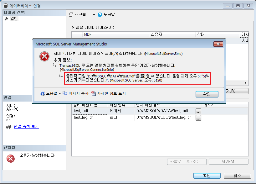 데이터베이스 분리 후 파일의 저장위치를 변경하고 연결(Attach) 시도 시 발생한 오류이다.