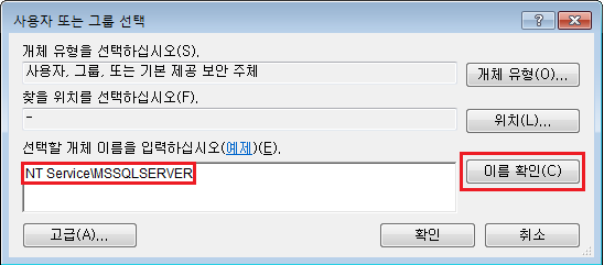 "NT Service\MSSQLSERVER" 를 입력해주고, [이름 확인] 버튼을 누른다.