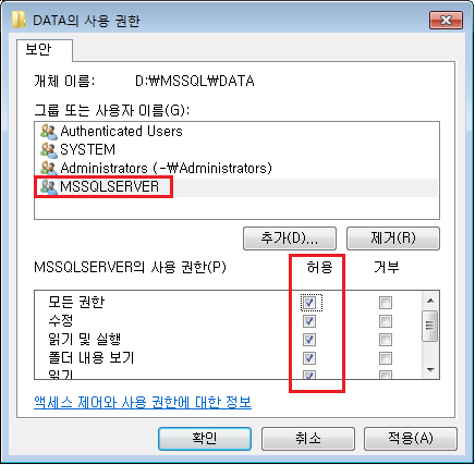 그룹 또는 사용자이름을 보면 MSSQLSERVER 가 있는데,