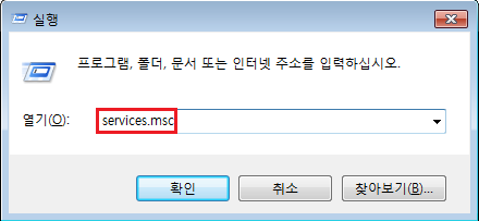 [윈도우+R] 실행 > "services.msc" 입력하여 서비스를 실행한다.