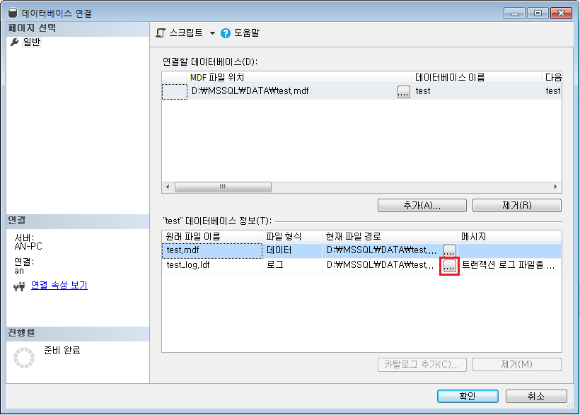 로그 파일(Log File, ldf) 을 아래 그림의 [....] 버튼을 눌러 경로를 지정해주어야한다.