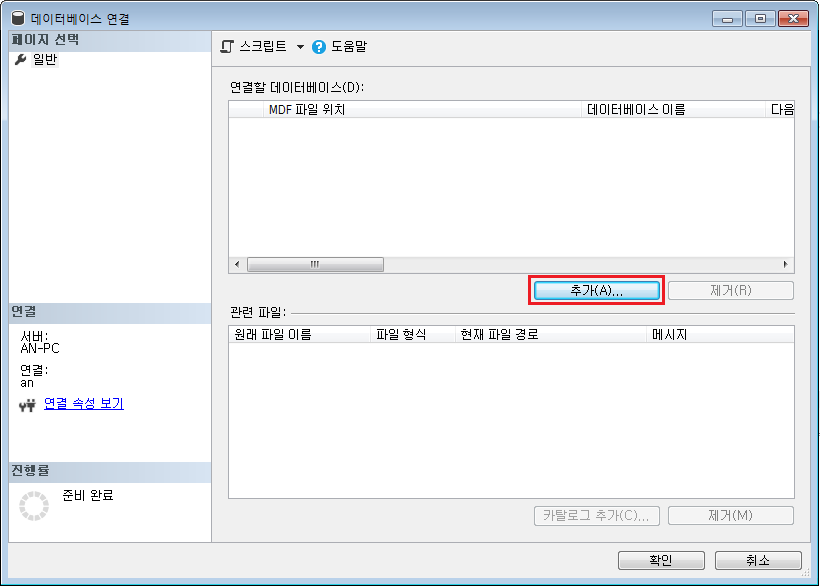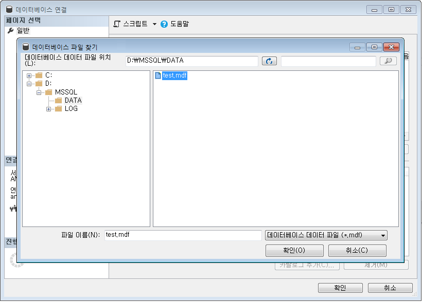추가 버튼을 선택하여 옮긴 위치의 데이터 파일 (Data File, mdf) 을 선택해준다.