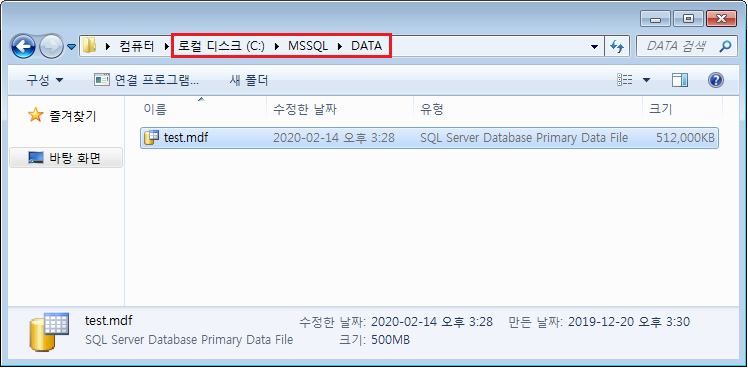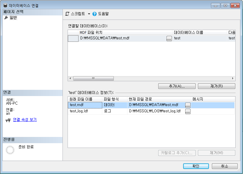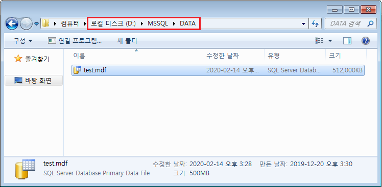 C:\MSSQL\DATA\test.mdf 에서 D:\MSSQL\DATA\test.mdf 로 옮겨주었다.