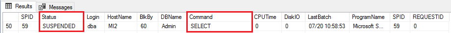 SELECT 명령어가 SUSPENDED(대기) 상태인 것을 볼 수 있다.