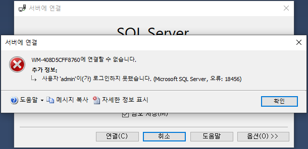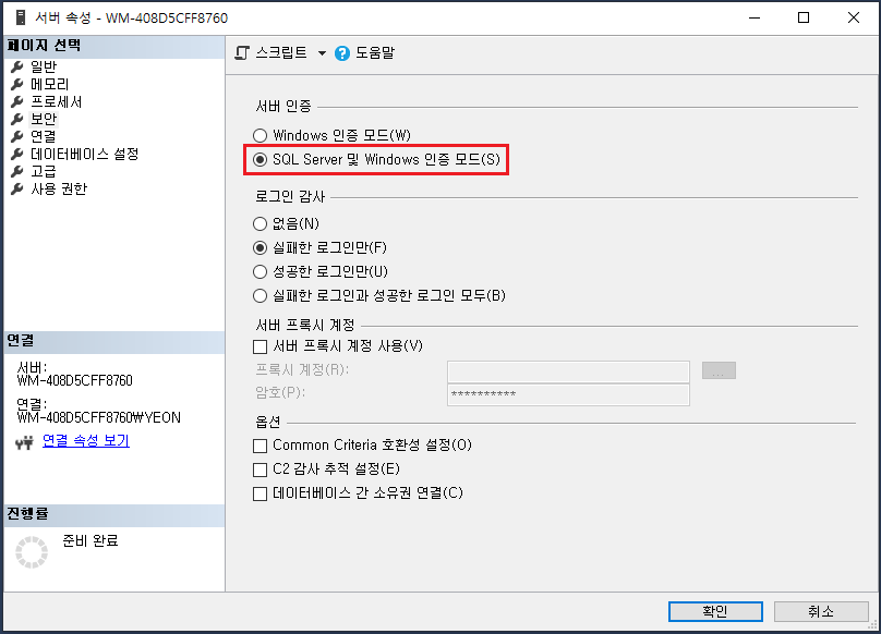 이를 해결하기 위해서 혼합 모드 (Windows 인증 + SQL Server 인증) 인증으로 변경해주면 된다.