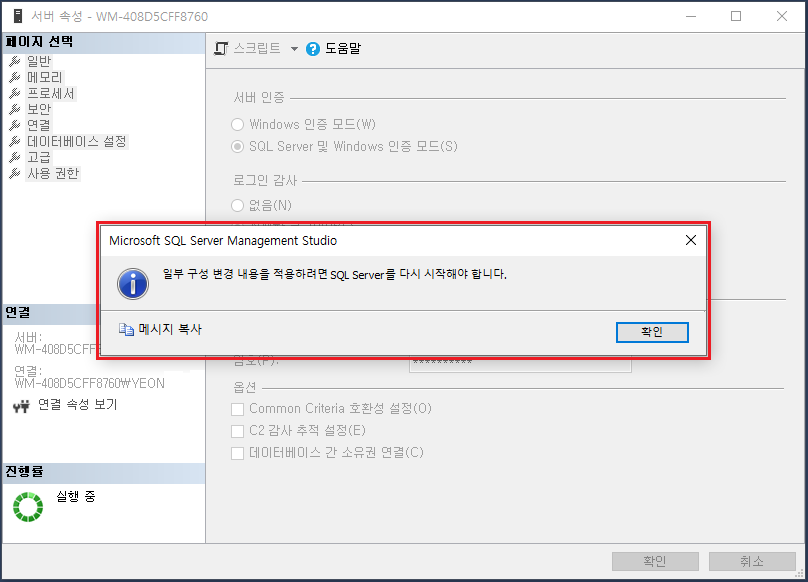 재시작 된 후, 다시 SSMS 에서 SQL Server 인증으로 로그인하면 정상 로그인된다.
