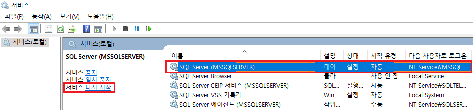 (5) SQL Server (MSSQLSERVER) 를 찾아서 서비스 다시 시작 버튼을 누르면 재시작된다.