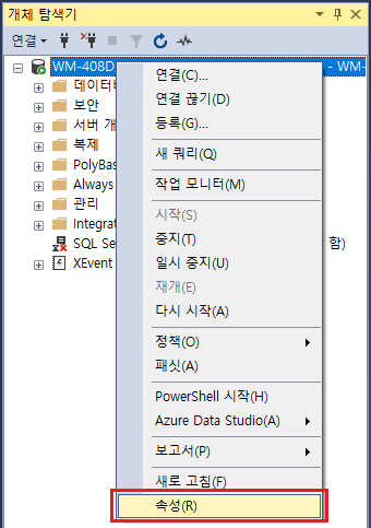 (1) Windows 인증으로 로그인 후 해당 서버를 우클릭 후 속성에 들어간다.