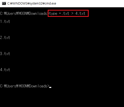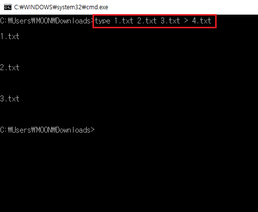 4. 'type' 명령어를 통해 파일 내용을 병합시켜준다. (두가지 방법이 있다.)