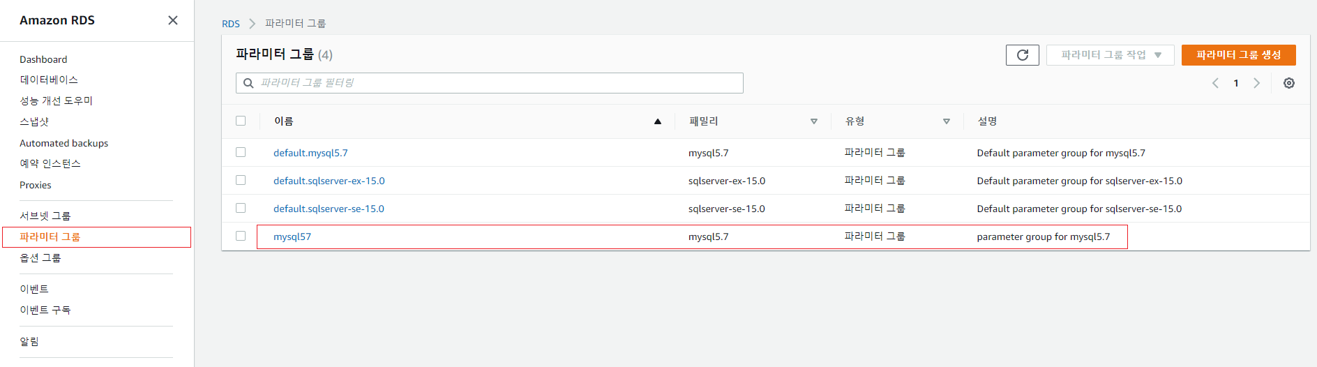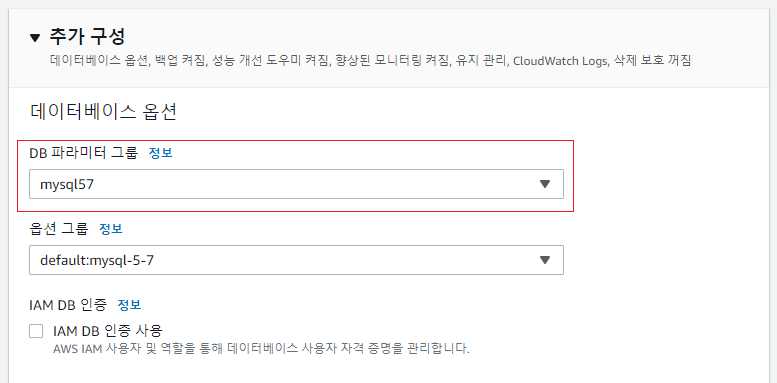 (나의 경우, [MYSQL57] 파라미터 그룹을 변경할 예정이다.)