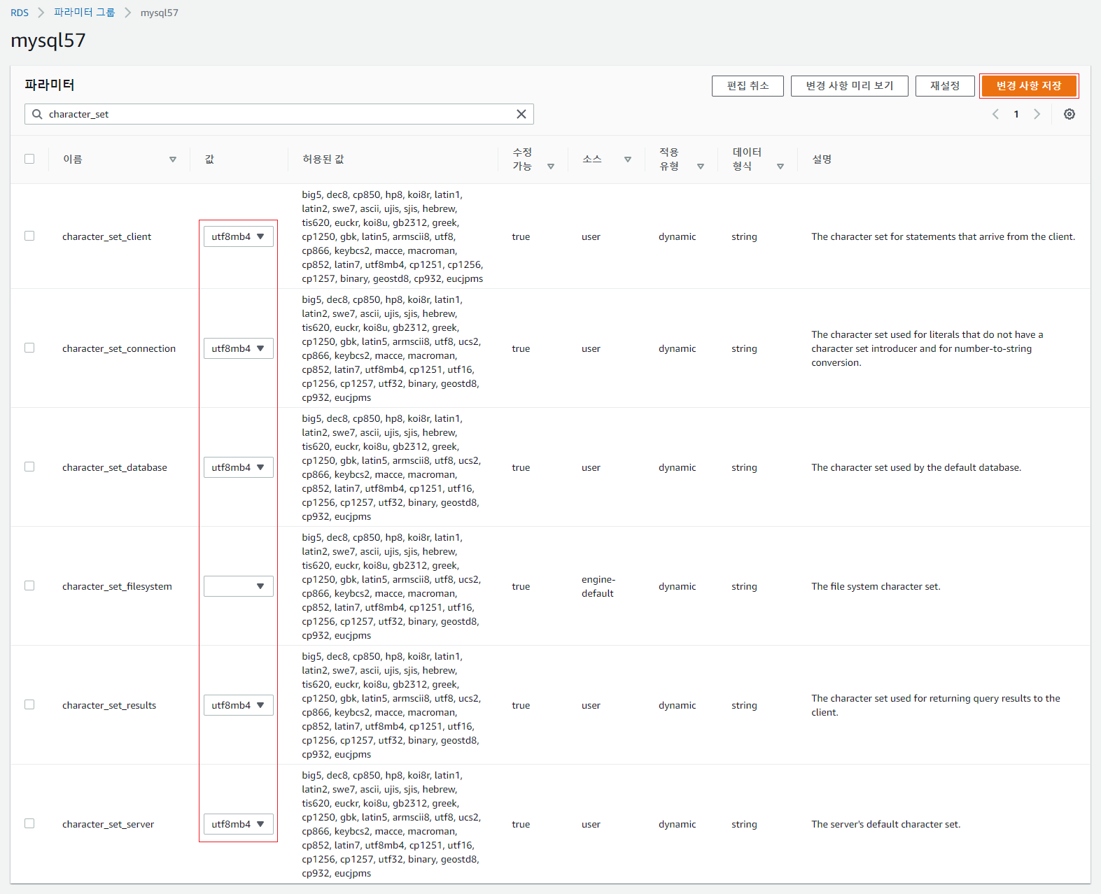 아래의 파라미터 값을 utf8 혹은 utf8mb4 로 모두 변경 후, 우측 상단의 [변경 사항 저장] 을 선택해 저장한다.