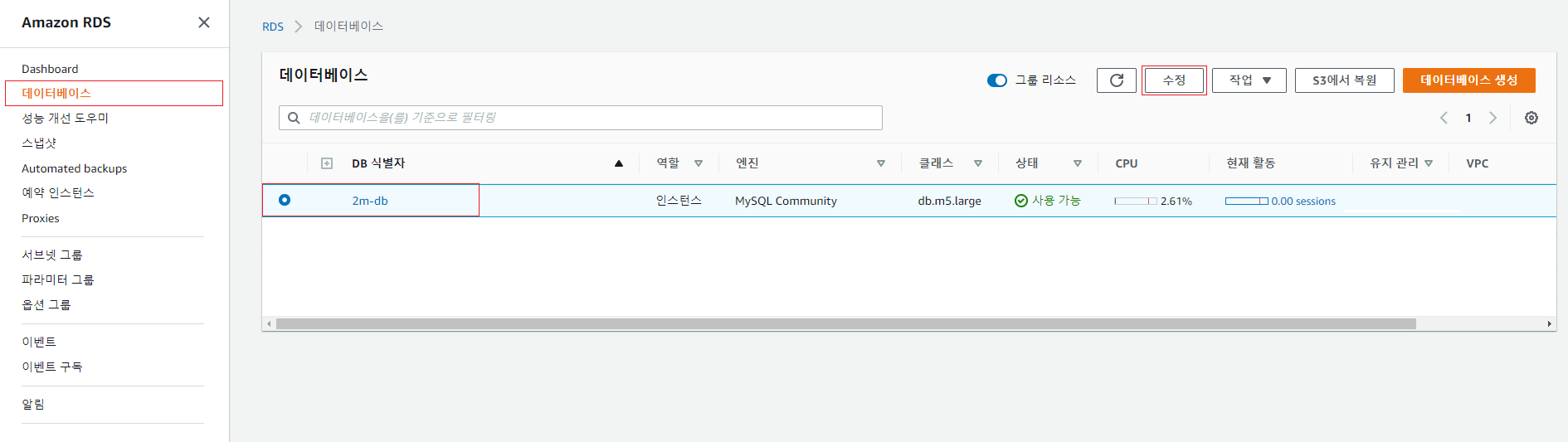 [RDS] - [데이터베이스] 에서 적용이 필요한 DB 를 선택 후, [수정] 을 선택한다.