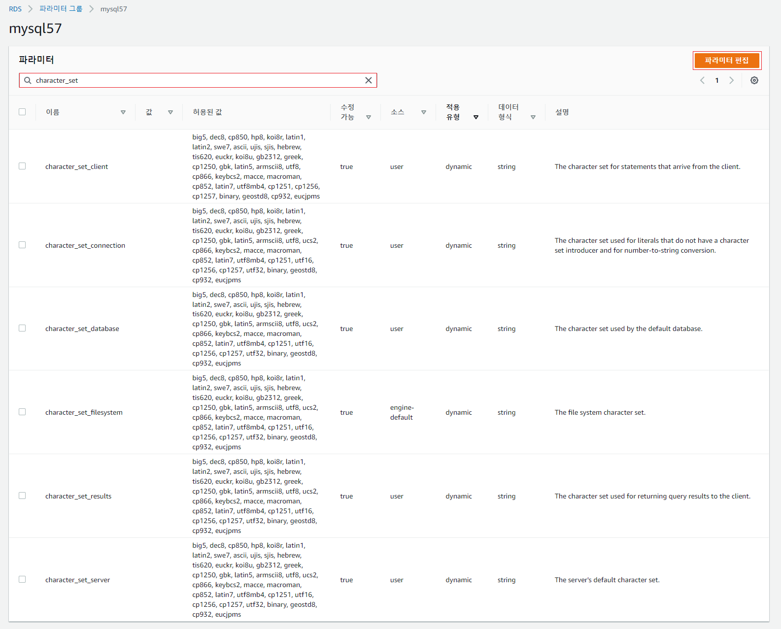 파라미터 검색창에 [character_set] 을 입력 후, 우측 상단에 [파라미터 편집] 을 선택한다.