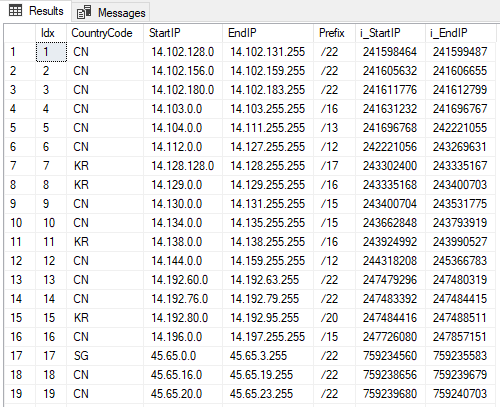 WHERE dbo.FN_LongIP(StartIP) <= @IpCheck AND @IpCheck <= dbo.FN_LongIP(EndIP)