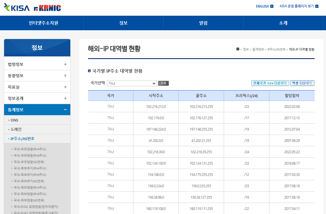 국가별 IP 대역 데이터는 한국인터넷정보센터(KRNIC) 에서 가져올 수 있다.