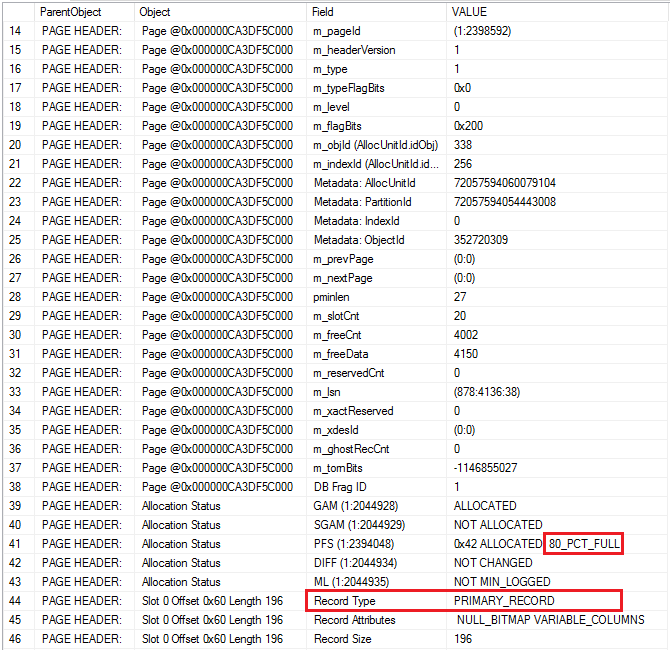 여기에서 41번째 행에 PFS 를 보면 해당 페이지가 얼마나 차있는지를 확인할 수 있다.