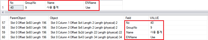 처음 결과가 해당 테이블 조회 결과이고, 두번째 결과가 DBCC PAGE 결과이다.