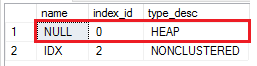 type_desc 가 HEAP 으로 조회되며, index_id 는 0 으로 조회된다.