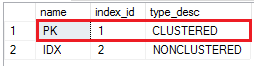 type_desc 가 CLUSTERED 로 조회되며, index_id 는 1 로 조회된다.