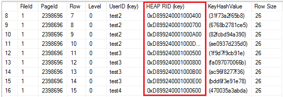 HEAP RID 는 해당 레코드의 위치를 나타내며, 이는 파일ID, 페이지ID, 슬롯번호를 포함한 8바이트 바이너리 값으로 표기된다.