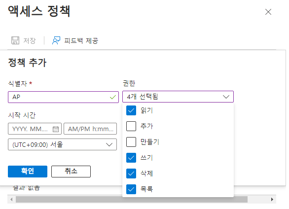 액세스 정책의 식별자, 권한, 시작/종료 시간을 선택해준다.
