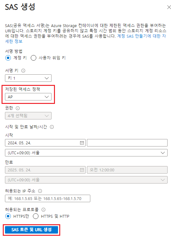 그리고 아까 만들어둔 저장된 액세스 정책을 연결해주고, SAS 토큰 및 URL 생성을 하면 Blob SAS 토큰이 생성된다.