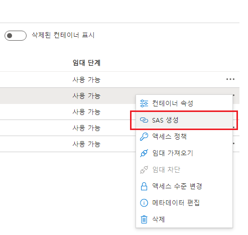 Azure Portal > 스토리지 계정 > 컨테이너 > 원하는 컨테이너의 SAS 생성 선택